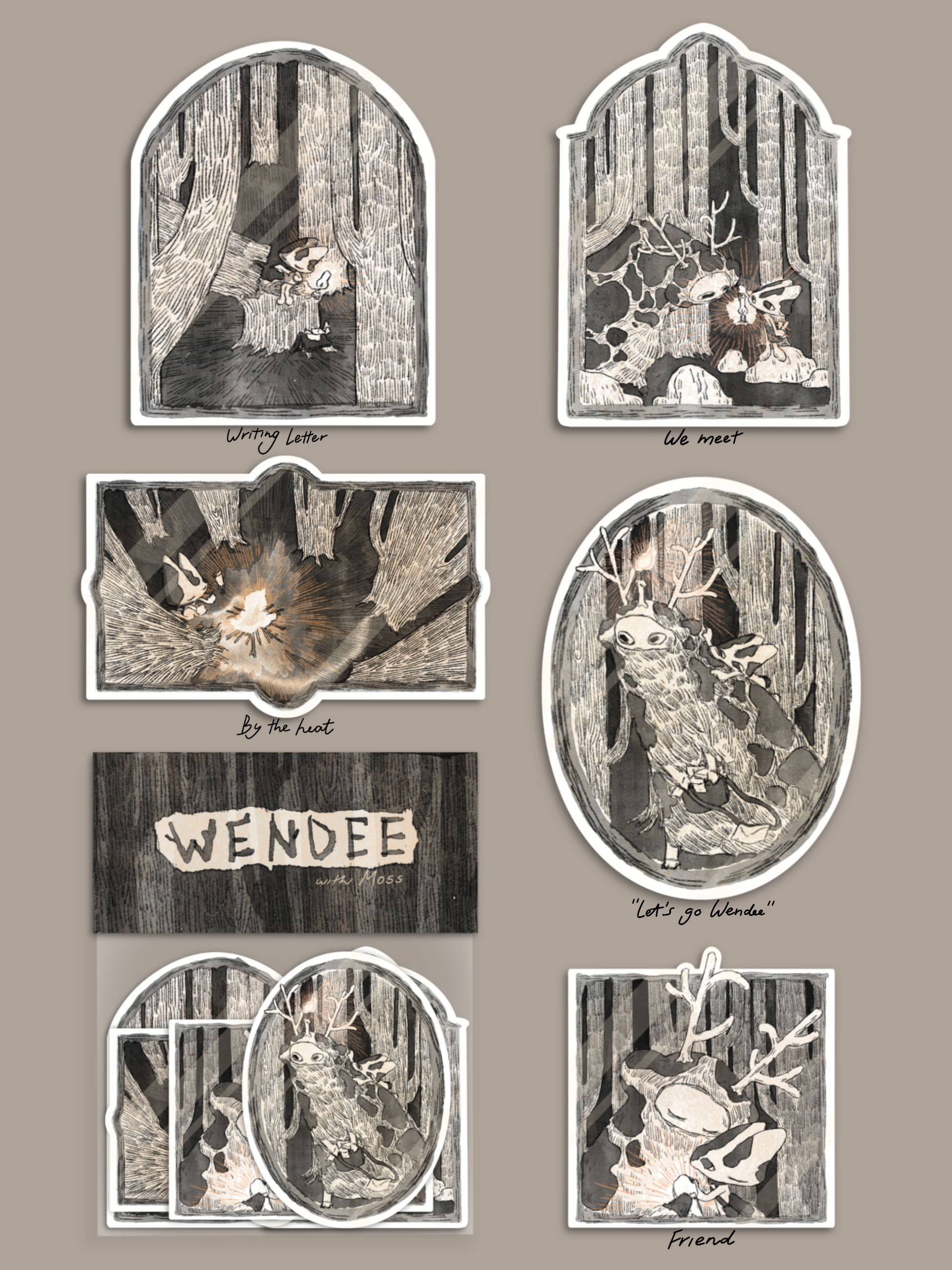 This 5-piece sticker pack features Wendee and Moss, capturing quiet moments from the beginning of their journey together — a brief encounter, a shared direction, and the choice to keep delivering letters side by side.